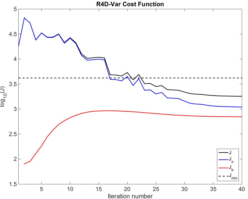 I am running the W4DVAR with strong constraint (NADJ=NTIMES) on an 800m resolution grid (40 vertical levels) with initial and boundary conditions taken from 3.7km regional NCOM (USEAST). The surface forcings are taken from a WRF model that is NOT coupled to the ROMS model. I am assimilating ship board ADCP profiles and CTD casts from a research vessel. My header, ocean.in and s4dvar.in files are in the attached zip file. I am getting these “rock in the pond” (Cauchy-Poisson problem) patterns in my velocity increment fields. They seem to be generated at the bottom model level and then propagate all the way to the surface. What I have discovered so far is that this issue does not show up if I use the incremental strong constraint (IS4DVAR). I have also tried smoothing the hell out of my bathymetry and changing my drag law specifications : no improvement. Has anyone else seen this problem before with the W4DVAR? Am I missing something obvious or is there something inherent to the dual form indirect representer based method that could cause this issue. Also I am running the 4DVAR with 1 outer loop and 40 inner loops and the cost function plot shows that it seems to have converged. Lastly, I am including a plot of the background/prior fields to show that these features are only present in the analysis.