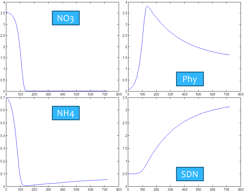 Frankly, i can learn from the second figure somewhat that phytoplankton growing rapidly along with nutrients consumed at a hing-speed. What i want to suspect in this case is no NO3 to be produced. As Katya said, i was not expected to gave the system a constant light intensity. But i could not understand from the first figure/case with DIURNAL_SRFLUX defined to introduce a day-night variation. I want to know why Phy decrease from initiation without even a minimum increase with NH4 been uptaken. Would that be the reason for much larger nitrification rate? I will have a try...In your second post, your first figure shows NO3 increasing with time and all other N pools decreasing. Rather than being the "good" run, this might be the "bad" run---i.e. this is what would happen if there were no light at all. The second figure, where NO3 depletes, is more what I would expect for a tropical mixed layer.