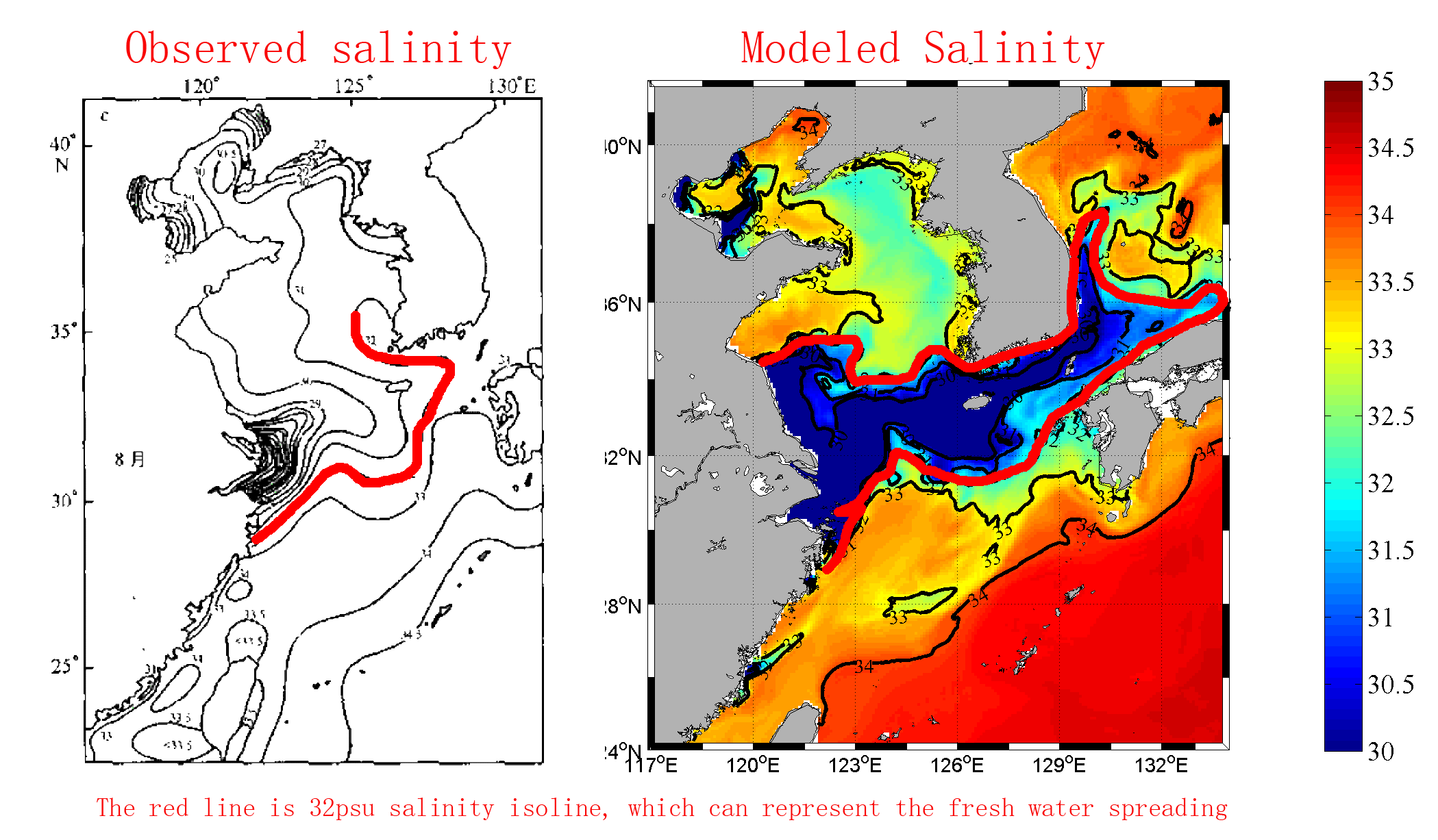 I have checked the information in this forum; usually the river discharged water cannot be spread away. However, in my case, the fresh water spread far away compare with the observed one, especially for the Changjiang River. The figures are the comparison of the observed sea surface salinity with model result. I have checked the volume of the Changjiang River which has no problem.