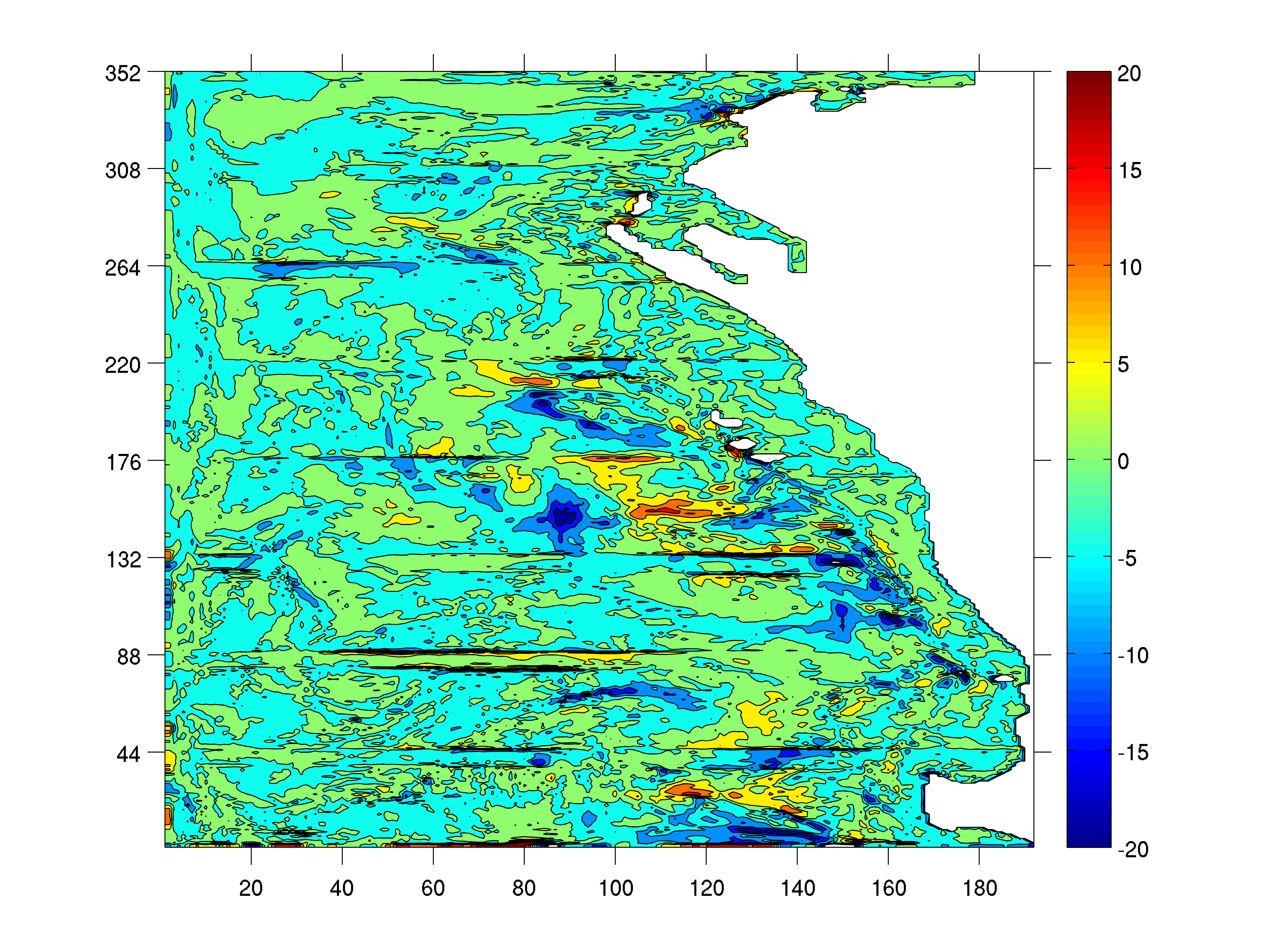 In an mpi implementation of ROMS 3.4 (32 processors; NtileI=4; NtileJ=8) for the southeast Indian Ocean, I have noticed artifacts in vertical velocity that appear to be associated with the grid decomposition. The model is set-up on a curvilinear horizontal grid (Lm=192;Mm=352) with 30 vertical levels (maximum depth 2000 m), and has been run for 4 years with 6 hourly output. The attached figure shows monthly average w (m/d) for a selected month at vertical level 15 as a typical example. The discontinuities in w appear to correspond with the j-grid decomposition (which is indicated on the figure by the position of the y tick marks). It looks like the w values are not being shared correctly between the j-direction partitions? Other fields (e.g. u,v) appear to be smooth. Is this a known problem?