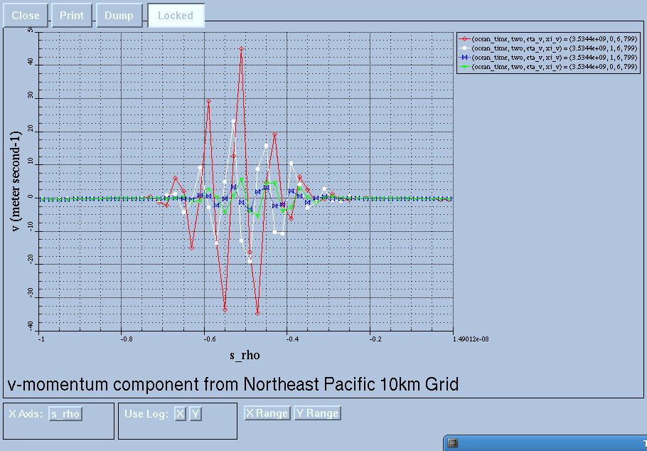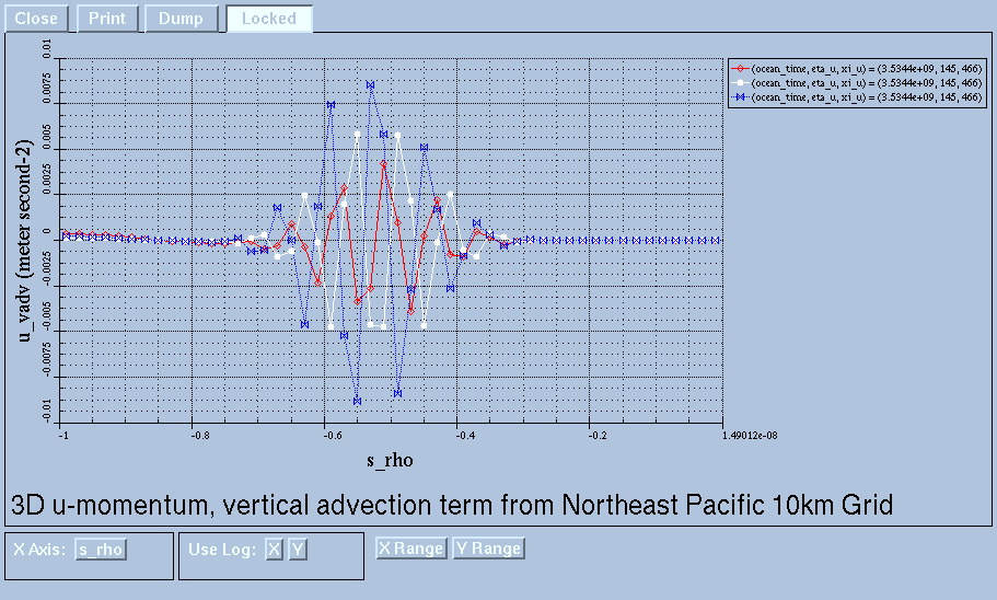 I'm going to attach some images, showing trouble in the vertical advection of u, taken when restarting just before the trouble. Has anyone ever seen anything like it? Have any advice? Is it time to smooth the heck out of the bathymetry? I've seen this sort of trouble on and off over the years and it has been hard to sneak up on because in other domains it would go away on restart, even with PERFECT_RESTART.