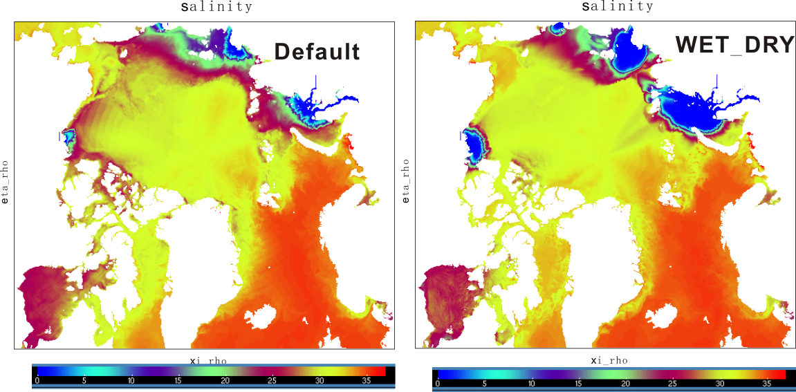 I am running ROMS ICE model. the model run smoothly without tide for 20 years. But after added tidal forcing to open boudary. it reports toubles in ice frazil. so I follow Kate's advices. I turn on #Define WET_DRY and make a test without tide. Fortunately, it work well and never give ice frazil problem. after integrated 8 months. I check the Sea Surface Salinity and found that river plumes is abnormal compared with undefined WET_DRY experiment. the river plumes simulated by experiment with WET_DRY extend enormously than experiment without . see picture below