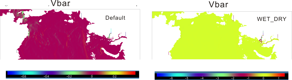 the vertical integrated V component of experiment with WET_DRY in the estuary can upto 6 m/s. While V component of experiment without WET_DRY is less than 1 m/s. the V componet of experiment with WET_DRY is approximate one order of magnitude greater than experiment without WET_DRY