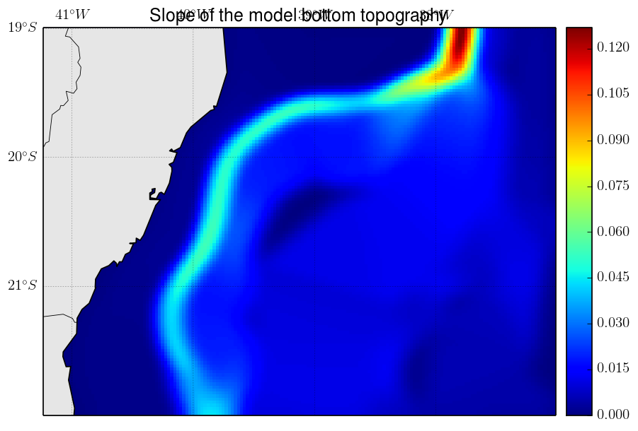 Yes, I have been looking at the horizontal velocity in the layer where its maximum is found (which is almost always in the first or second S-level near the bottom), see my first post. Regarding the maximum slope in the north part of the domain, it is gone now, I switched to a near-even slope all along the continental slope (see the "second decreased bottom slope" figure on my last post). I simply linearly interpolated between the 200 m and 2000 m isobaths. After that switch, the maximum HPGE decreased by ~4 cm/s and spreaded all along the continental slope. But the maximum HPGE indeed was in that steepest slope in the north prior to this switch.hugobastos wrote:Also note that your maximum hpge will be close to the north since there is a large slope there...it will be nice to see your velocity horizontal distribution close to the bottom ( or the layer that have the maximum value...).