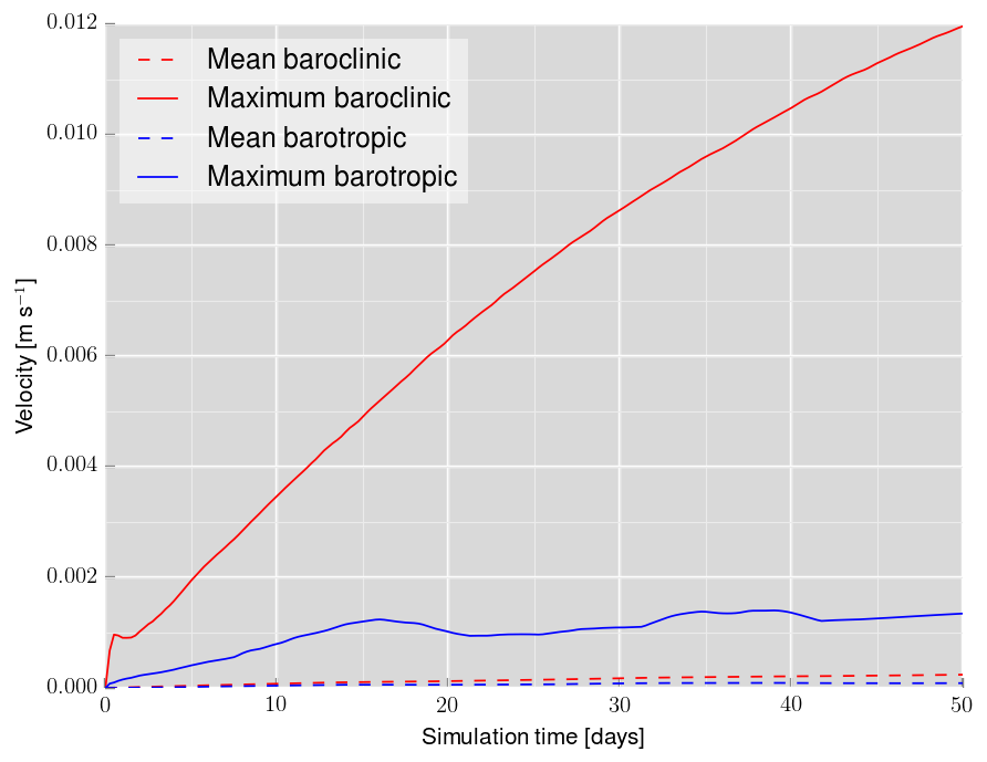 After day ~50, weird banded structures just like the ones described in this post (viewtopic.php?f=17&t=3323) start to develop (see example attached), and increase the noise on the continental slope to ~4-6 cm/s. Since I am not too interested in integrating beyond day ~50, I should be fine with those. But following the suggestion of that post's author, I tried switching from MIX_GEO_UV to MIX_S_UV, and there was a decrease in ~1.5 cm/s in this banded-like noise, and its development was delayed in ~10 days (not shown).
