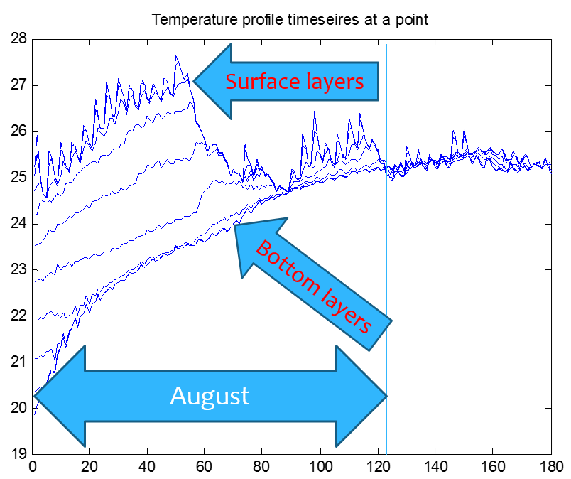 I plot the temperature time series of a station in area we thought to be most clear to depict the forming-destroying life of thermocline. But in my model output, the thermoclines kept living for ca. half month (near the 60 steps in the figure attached), then the upper layers temperature were pulled down abruptly and the thermoclines almost disappear. As was mentioned, the surface mixing layer was broken up at mid Sep in this area and it should also has a gradually weakened life time. I have been checked many times for temp related variables, advection schems and etc, but all failed.
