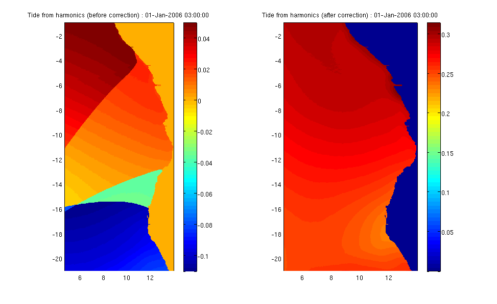 & COS(omega-(2*pi*SSH_Tphase(i,j,itide)/Tperiod(itide))The reason why I'm so interested in the tides is because I want to add the tidal model into the observations so I can assimilate SSH whilst still including tides! Computing the tidal contribution to zeta from the tidal forcing harmonics in the same way as ROMS seemed like the best way to add the tides to the AVISO SSH observations for assimilating.