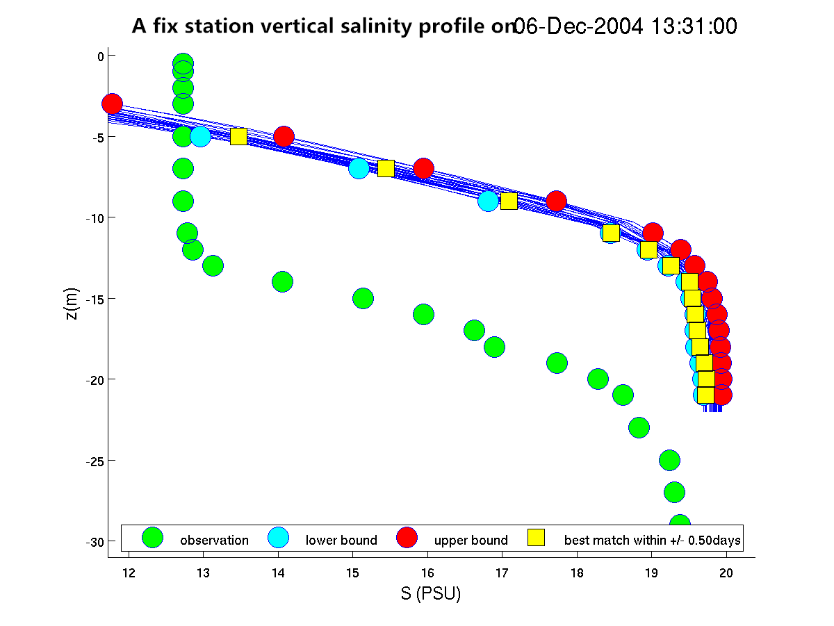 Blue line is the model results;Green points are measurement. It is happening in winter. Down-estuary Wind is large.