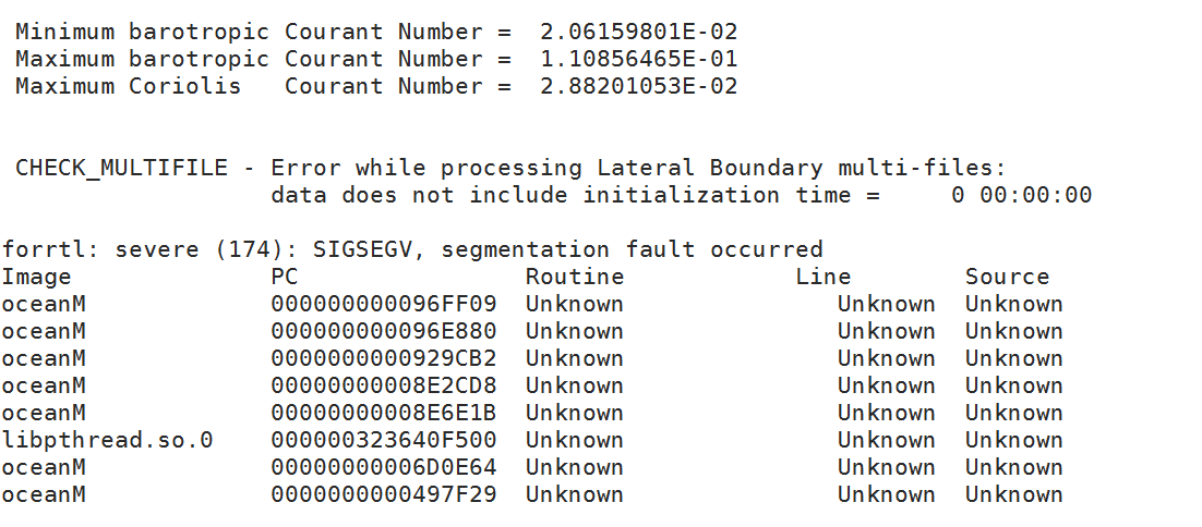 Second, when getting that sort of seg fault report, I would recompile with USE_DEBUG turned on and rerun. At least some of those "Unknown"s should turn into useful information. The name of the executable should change to oceanG.