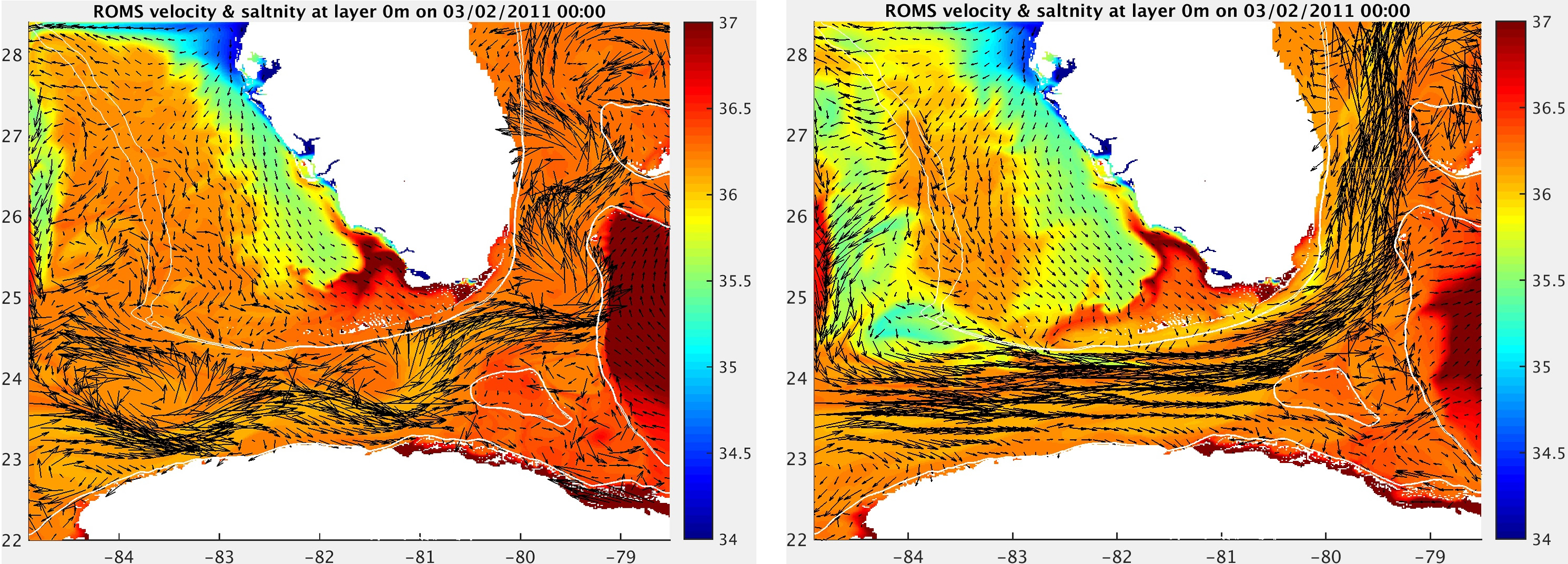 Without tide, the model runs fine (figure 3 right panel). Then I used the TPXO2ROMS_v4pt0 package (developed by johnluick in this thread: viewtopic.php?f=23&t=2482) to generate tidal forcing file from TPXO8 for my model domain. The tide reference time is 01/01/2011. I have compared several tidal constituents’ Eamp, Ephase, tidal eclipses and tidal currents (generated from this package) with literatures, all seem ok. However, when I applied the tidal file to the model domain, the model runs but the Florida Current quickly (in about 3 weeks) broke into several big eddies in the Florida Straits, which is quite problematic (see the following figure left panel).