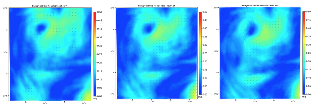 I am running the W4DVAR with strong constraint (NADJ=NTIMES) on an 800m resolution grid (40 vertical levels) with initial and boundary conditions taken from 3.7km regional NCOM (USEAST). The surface forcings are taken from a WRF model that is NOT coupled to the ROMS model. I am assimilating ship board ADCP profiles and CTD casts from a research vessel. My header, ocean.in and s4dvar.in files are in the attached zip file. I am getting these “rock in the pond” (Cauchy-Poisson problem) patterns in my velocity increment fields. They seem to be generated at the bottom model level and then propagate all the way to the surface. What I have discovered so far is that this issue does not show up if I use the incremental strong constraint (IS4DVAR). I have also tried smoothing the hell out of my bathymetry and changing my drag law specifications : no improvement. Has anyone else seen this problem before with the W4DVAR? Am I missing something obvious or is there something inherent to the dual form indirect representer based method that could cause this issue. Also I am running the 4DVAR with 1 outer loop and 40 inner loops and the cost function plot shows that it seems to have converged. Lastly, I am including a plot of the background/prior fields to show that these features are only present in the analysis.