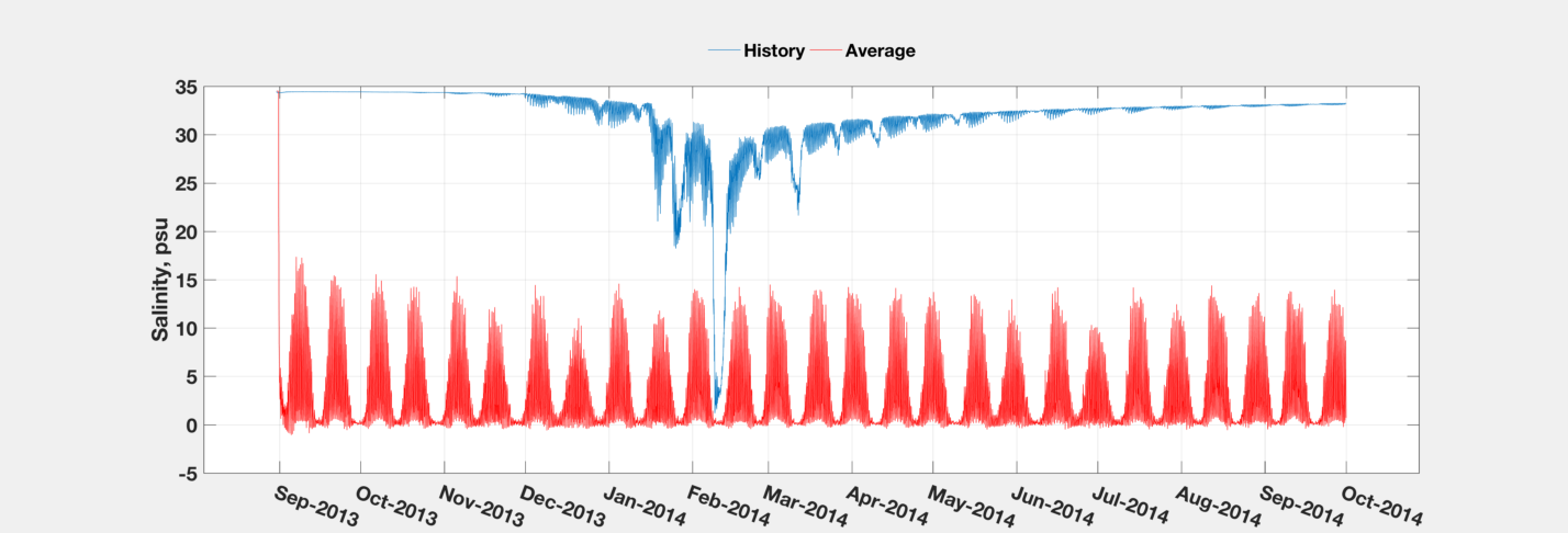 I confirm that the time series I am comparing are of the same time coordinate. These are the outputs of the entire simulation. There is negligible freshwater inflow during the first three months as it is the dry season at my study site. That is why the historical salinity maintained at a high level, and also the reason that makes the sharp decline of the averaged salinity unrealistic.