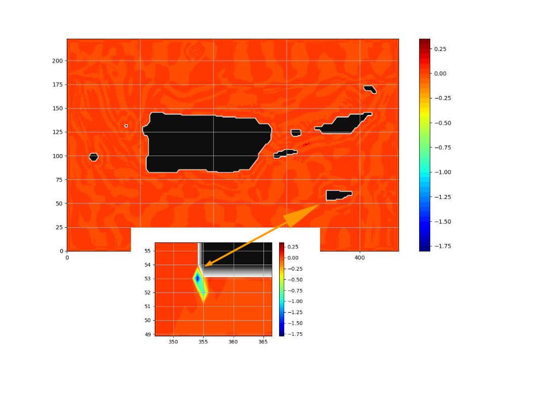 As shown, this anomaly is occurring at the corner of the masked region. Everywhere else, the value of u_hvisc is almost negligible (order of 10^-06). Can anyone shed some light on this? I am not sure what parameters should be modified to prevent this anomaly near the surface points.