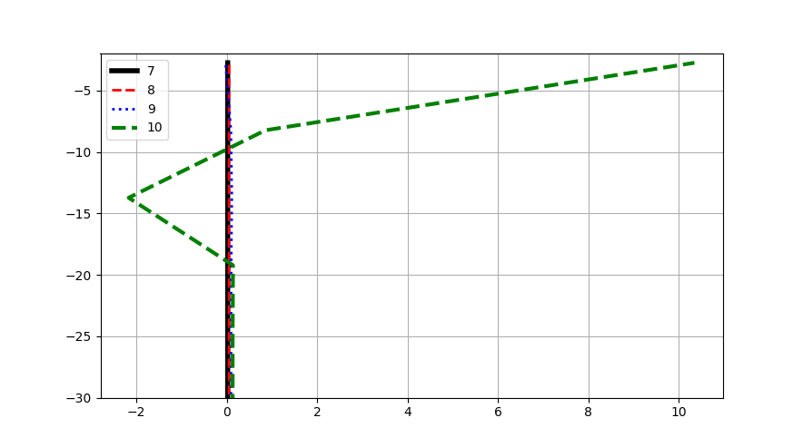 My ROMS setup is showing unrealistic velocities near the surface at the locations right next to the masked areas. The diagnostic output shows that the viscous fluxes (u_hvisc, v_hvisc) are shooting up to very high levels, messing up the velocity profiles only at the sigma points near the surface. Below, is a plot showing the profile of u_hvisc at time steps 7,8,9,10 at a point right beside the masked region.