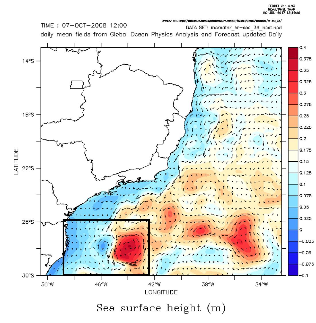 The average flow seems to be overestimated as well, as shown in the pictures of averaged surface currents. ROMS currents are stronger than MERCATOR and other global models such as HYCOM NCODA, specifically along the slope in the domain of Brazil Current.