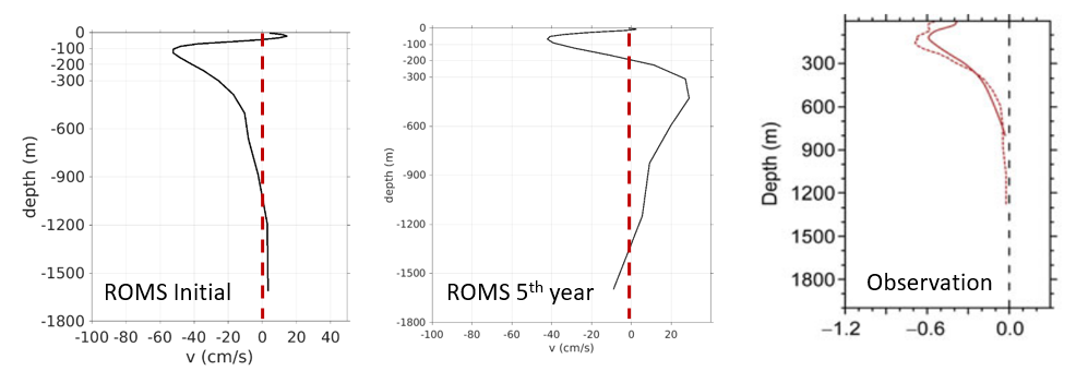 I have a problem on my vertical profile of velocity in almost all area in my model domain. The vertical profile of meridional velocity has a counter current below the thermocline layer. I can sure the initial condition of T and S is quietly good. In the initial simulation, the velocity profile is good enough. But longer the simulation, the counter current is developed. It is really different to the annual mean of observation data at the same area. I attached the example of figure below in my attachment.
