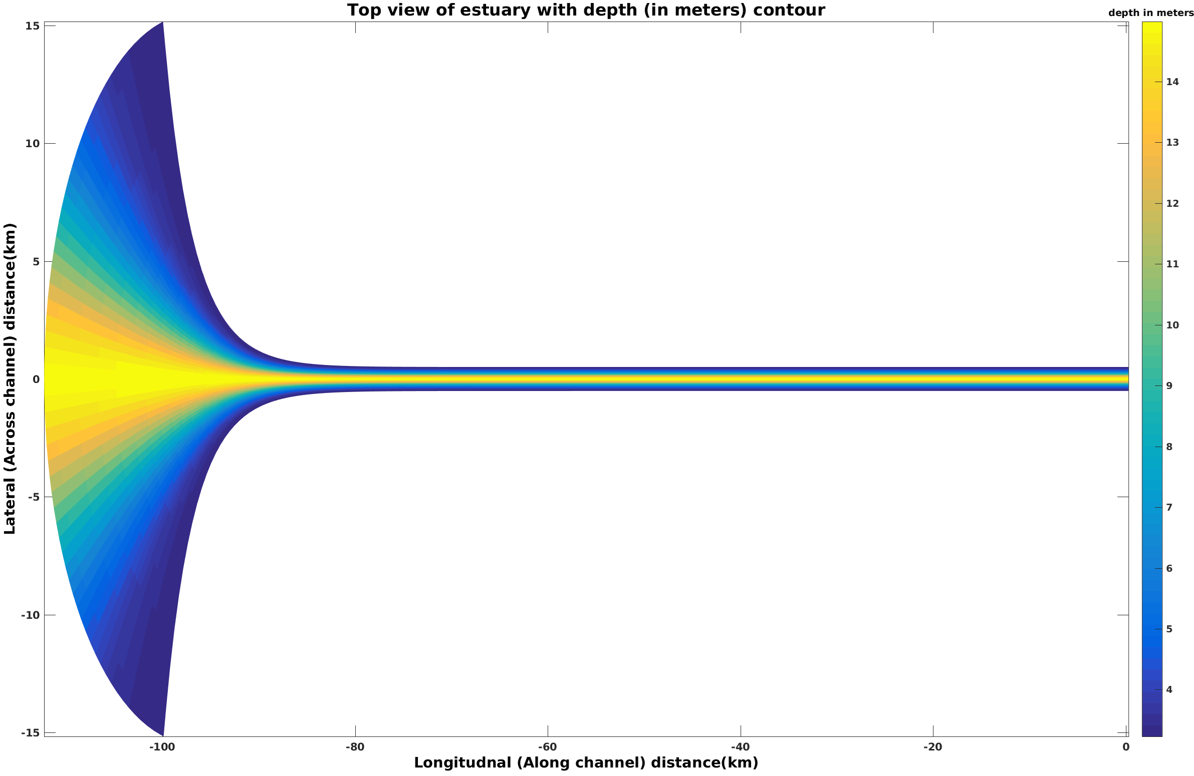 I am trying to model an idealized estuary with the following bathymetry (exponentially converging zone followed by prismatic channel). Both the length, width and depth of the domain is analytically prescribed, as shown in the attached figure. I think curvilinear grid would be a good option for this geometry. I have tried octant but encountered a lot of problems in compilation. I am also aware of seagrid - but it seems that it is mainly used for realistic bathymetry. Can anyone help me with some recommendations for a good tool to analytically generate an idealized curvilinear grid for such a problem?