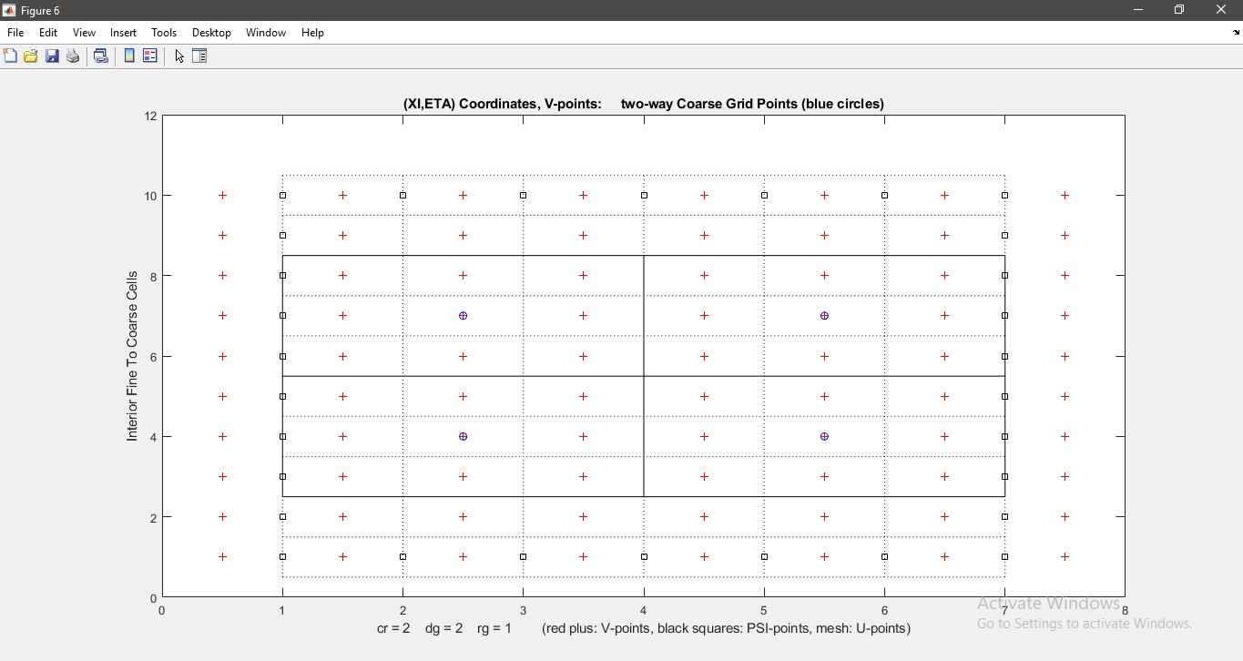 %% create grd nc of parent domain [99-140,0-26] >> x = 99:1:140; >> y = 0:1:26; >> [rlon,rlat] = meshgrid(x,y); >> rlon = rlon'; >> rlat = rlat'; >> Ga = 'test1_grd_a.nc'; >> G1 = set_grid(rlon,rlat,Ga,'spline','f'); %% nest: subdomain from parent [128-138,14-24] >> Gc = 'test1_grd_c.nc'; >> Imin = 30; >> Imax = 40; >> Jmin = 15; >> Jmax = 25; >> Gn2 = coarse2fine(Ga,Gc,5,Imin,Imax,Jmin,Jmax); %% nest grid contact >> Cnames = 'test1_ngc2_5.nc'; >> Gnames = {Ga,Gc}; >> [S,G] = contact(Gnames, Cnames);I checked the lon/lat_rho or lon/lat_psi of parent and subparent grid file, and made sure they had common points.Code: Select all
