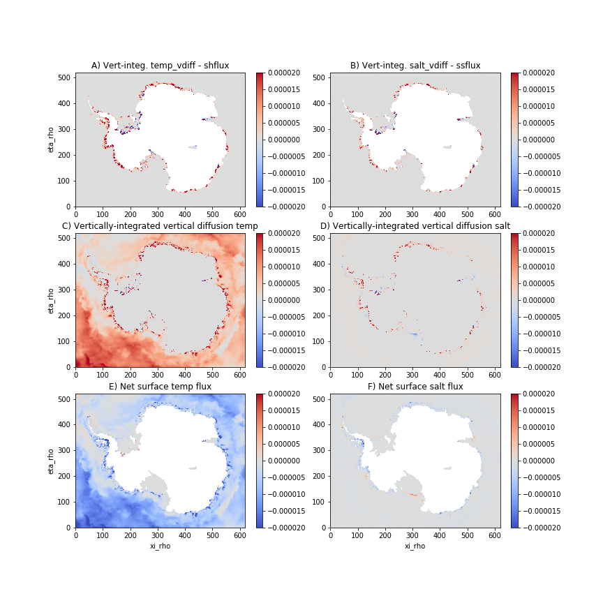 So I did plot the vertically-integrated terms (attached), in an attempt to reproduce the analyses you did in your 2006 JPO paper (fig. 10), but annually averaged. As we know, the vertical diffusion term when depth-integrated should be equal to the net surface flux (panel C below). That flux entering or leaving the model domain should be transported by other terms via vertical/lateral fluxes (advection and diffusion), and result in a temperature/salinity tendency (temp_rate/salt_rate, panel A). The panel B shows the vertically-integrated LHS minus the sum of the RHS terms (C, D, E, F), which has a residue a few order of magnitude smaller than the individual terms (O(10^-5) degC/day). I think that makes sense and indicates the model has a closed budget, would you agree? So the upper layer is not direct balanced in the horizontal integral because the surface fluxes enter the ocean in that layer but are distributed in the vertical (and lateral) by individual components of the temperature/salinity fluxes - but they do balance when all terms are depth-integrated.