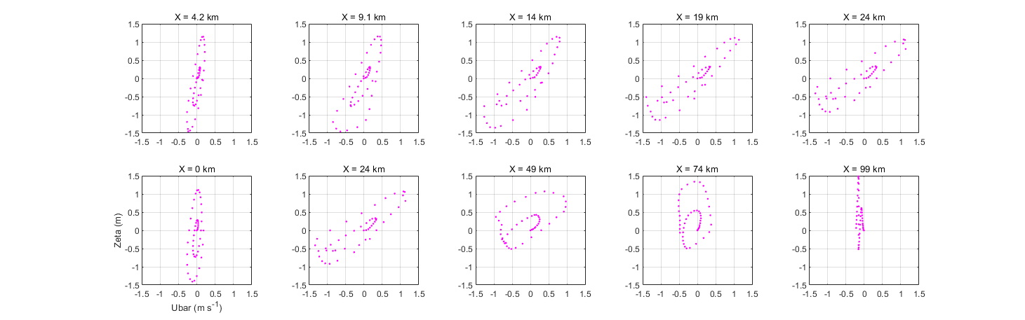 Looking at zeta vs ubar for selected points along-channel turned out as: