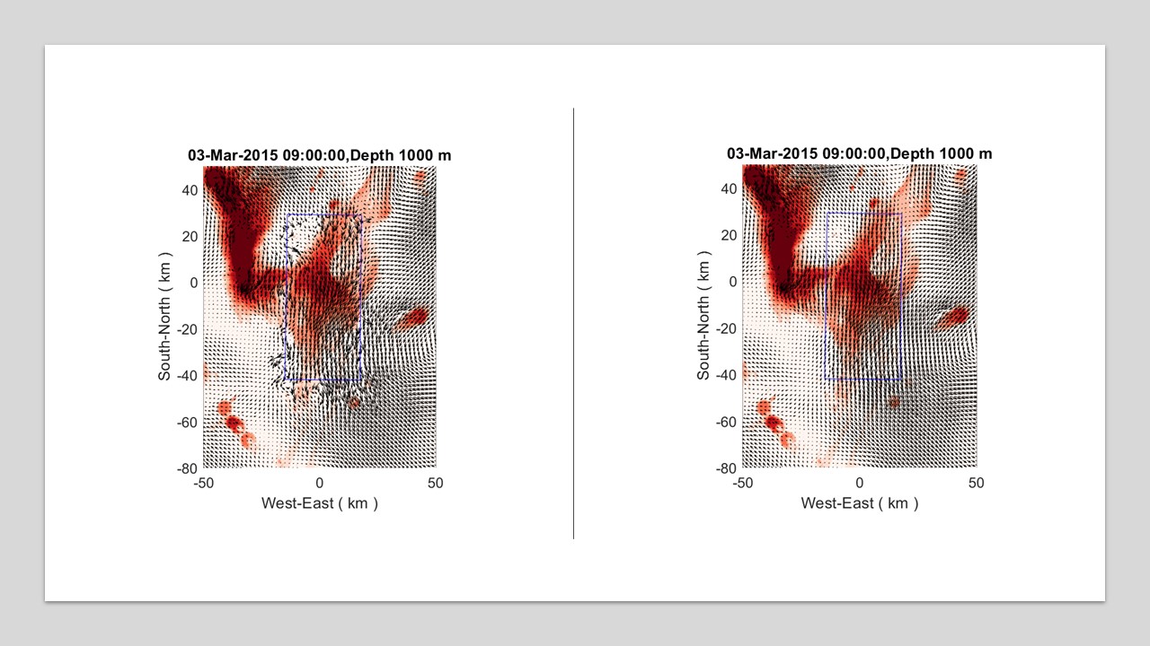 The plots below show 2D velocities and the 3D velocities sampled at 1000 m depth. The two-way results are on the left and the one-way results are on the right. For those one-way results, I averaged the fine-grid solutions based on the 5:1 refinement ratio and used the averages to replace the coarse-grid solutions at collocated grid points. It is noticeable that the two-way results show apparent discontinuities near the nesting interface. The disruption in flow mostly occurs at the locations where the bathymetry changes significantly across the nesting interface. In comparison, the one-way results are much smoother, in which the nesting interface appears almost transparent, which is a sign that the interface is behaving properly. Such differences between one-way and two-way experiments are persistent in all the tests I have done that feature realistic bathymetry as shown in my previous posts.