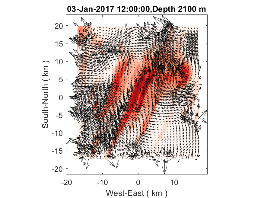 The plots below show 2D velocities and the 3D velocities sampled at 1000 m depth. The two-way results are on the left and the one-way results are on the right. For those one-way results, I averaged the fine-grid solutions based on the 5:1 refinement ratio and used the averages to replace the coarse-grid solutions at collocated grid points. It is noticeable that the two-way results show apparent discontinuities near the nesting interface. The disruption in flow mostly occurs at the locations where the bathymetry changes significantly across the nesting interface. In comparison, the one-way results are much smoother, in which the nesting interface appears almost transparent, which is a sign that the interface is behaving properly. Such differences between one-way and two-way experiments are persistent in all the tests I have done that feature realistic bathymetry as shown in my previous posts.