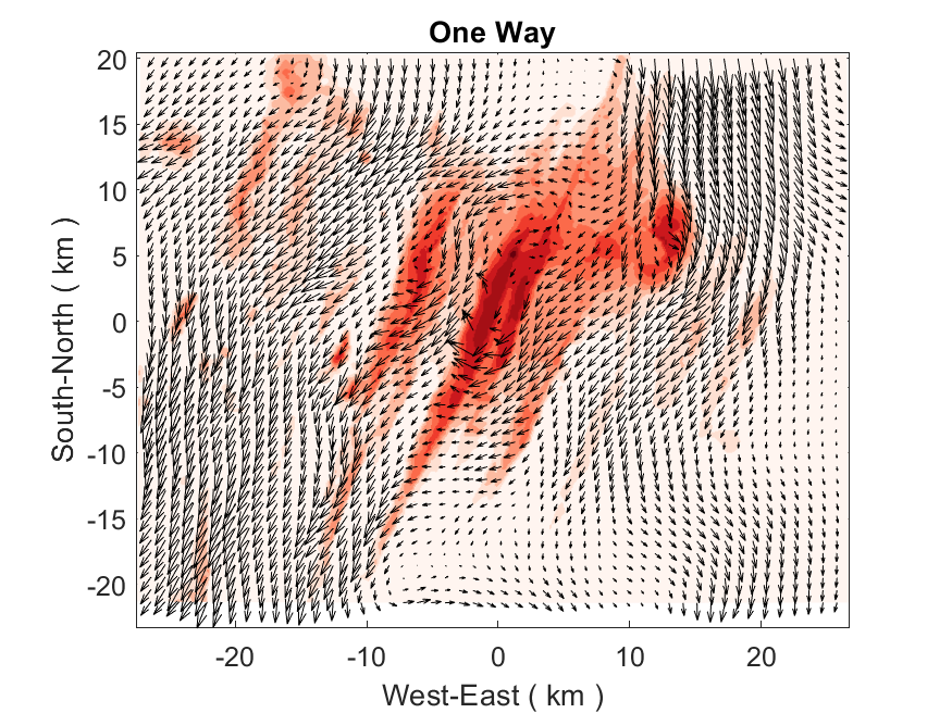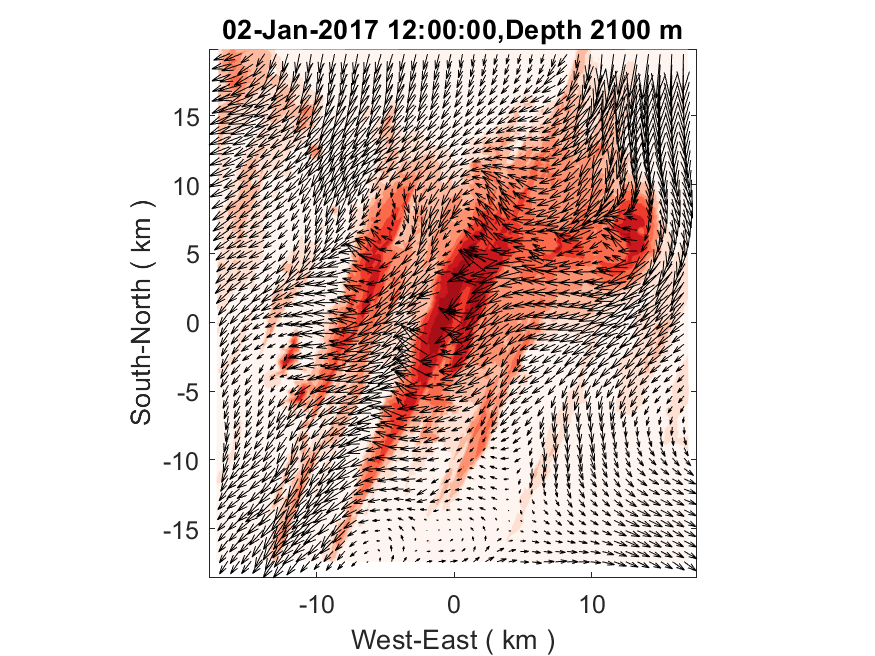 The plots below show 2D velocities and the 3D velocities sampled at 1000 m depth. The two-way results are on the left and the one-way results are on the right. For those one-way results, I averaged the fine-grid solutions based on the 5:1 refinement ratio and used the averages to replace the coarse-grid solutions at collocated grid points. It is noticeable that the two-way results show apparent discontinuities near the nesting interface. The disruption in flow mostly occurs at the locations where the bathymetry changes significantly across the nesting interface. In comparison, the one-way results are much smoother, in which the nesting interface appears almost transparent, which is a sign that the interface is behaving properly. Such differences between one-way and two-way experiments are persistent in all the tests I have done that feature realistic bathymetry as shown in my previous posts.