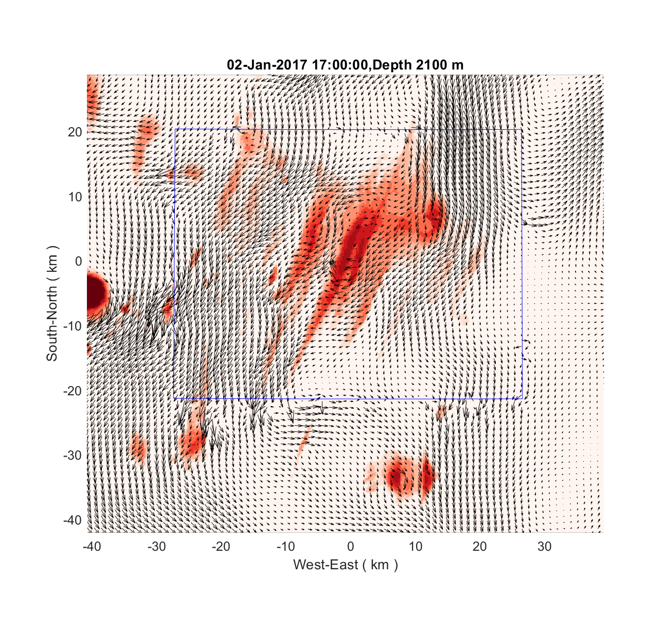 I have attached a few plots from a recent experiment that shows the simulated flow field near a ridge segment at 2100 m depth over the refined grid that is embedded in a coarse grid. There is a map that shows the bathymetry with the full domain and the outline of the nested fine grid. The refinement ratio is 5:1. The two plots that show the flow field are from two parallel runs wherein one-way and two-way nesting are used. Comparing the two plots, the results from the two-way run seems problematic as the currents appear to be disrupted at the boundaries whereas the one-way run shows no such disruption. From the answers I got from the forum on my previous post, I suspect the problem lies in the mismatch between the refined and coarse bathymetries. However, in this current experiment, I have relaxed the refined bathymetry to match the coarse bathymetry near the nesting boundaries. Also, if the problem is caused by bathymetry mismatch, it is interesting that two-way nesting is affected to a much greater degree than one-way nesting.