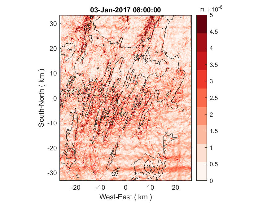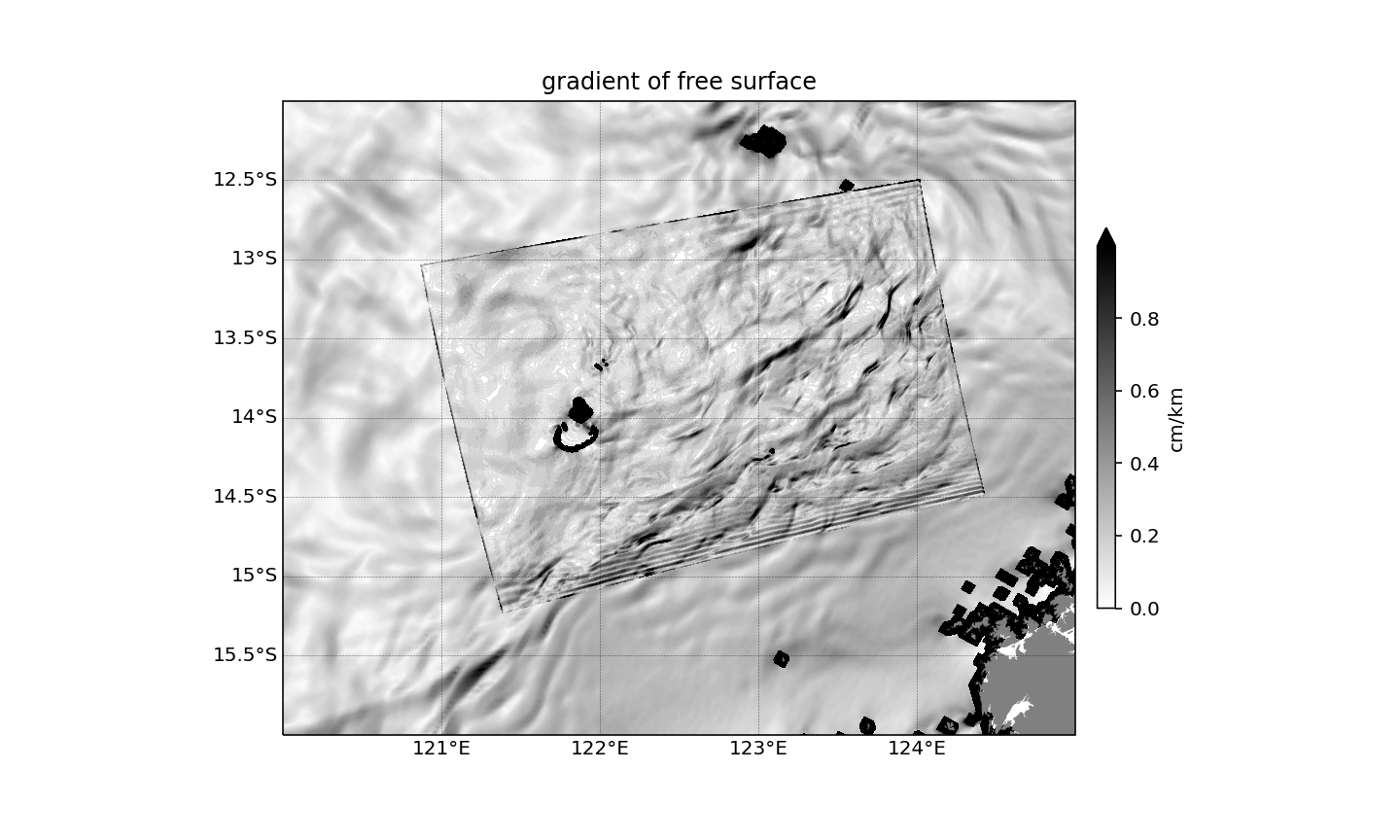 Thanks a lot for all the instructions. I managed to rebuild my grids using the fine-to-coarse approach and finished a test run using one-way nesting. The refinement ratio between the coarse and fine grids is 3. I have attached an animation showing hourly sampled sea-surface gradients over a 2-day span since the start of the simulation. Unfortunately, those much dreaded horizontal strips are still there despite the change in the domain size of the fine grid and switching to the fine-to-coarse approach. Note that those stripes seem to come and go like a surface wave originating from the southern nesting interface. As Stefan pointed out previously, the wavelength suggests a period of 30 sec, which is the coarse-grid time step. So it seems that a perturbation in sea surface is introduced at the southern interface each time the fine grid reads outputs from the coarse grid. I do not know if this is a time stepping issue as suspected by Ivica but my previous test seemed to suggest those stripes are gone after using the same time step for both fine and coarse grid.