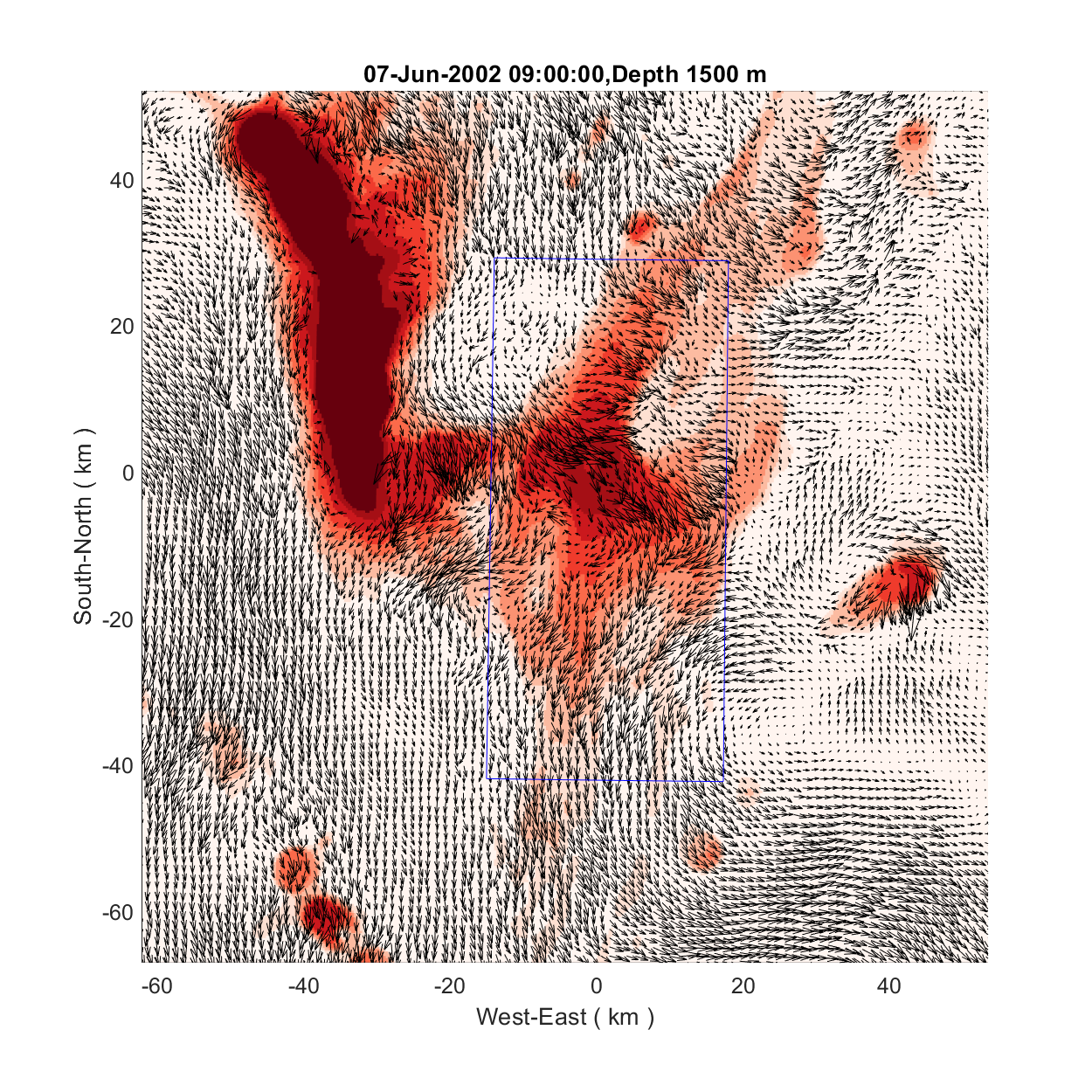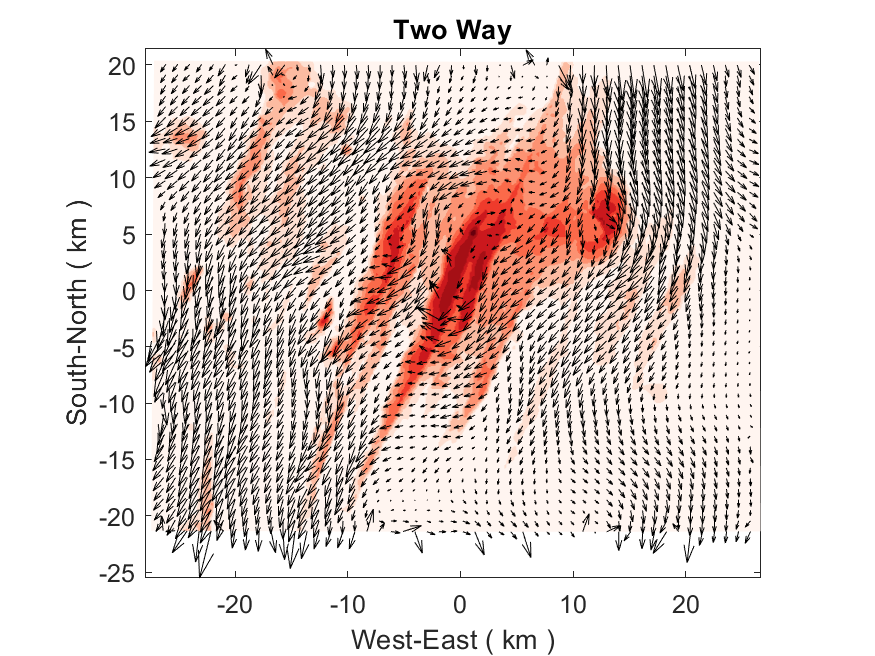 The plots below show 2D velocities and the 3D velocities sampled at 1000 m depth. The two-way results are on the left and the one-way results are on the right. For those one-way results, I averaged the fine-grid solutions based on the 5:1 refinement ratio and used the averages to replace the coarse-grid solutions at collocated grid points. It is noticeable that the two-way results show apparent discontinuities near the nesting interface. The disruption in flow mostly occurs at the locations where the bathymetry changes significantly across the nesting interface. In comparison, the one-way results are much smoother, in which the nesting interface appears almost transparent, which is a sign that the interface is behaving properly. Such differences between one-way and two-way experiments are persistent in all the tests I have done that feature realistic bathymetry as shown in my previous posts.