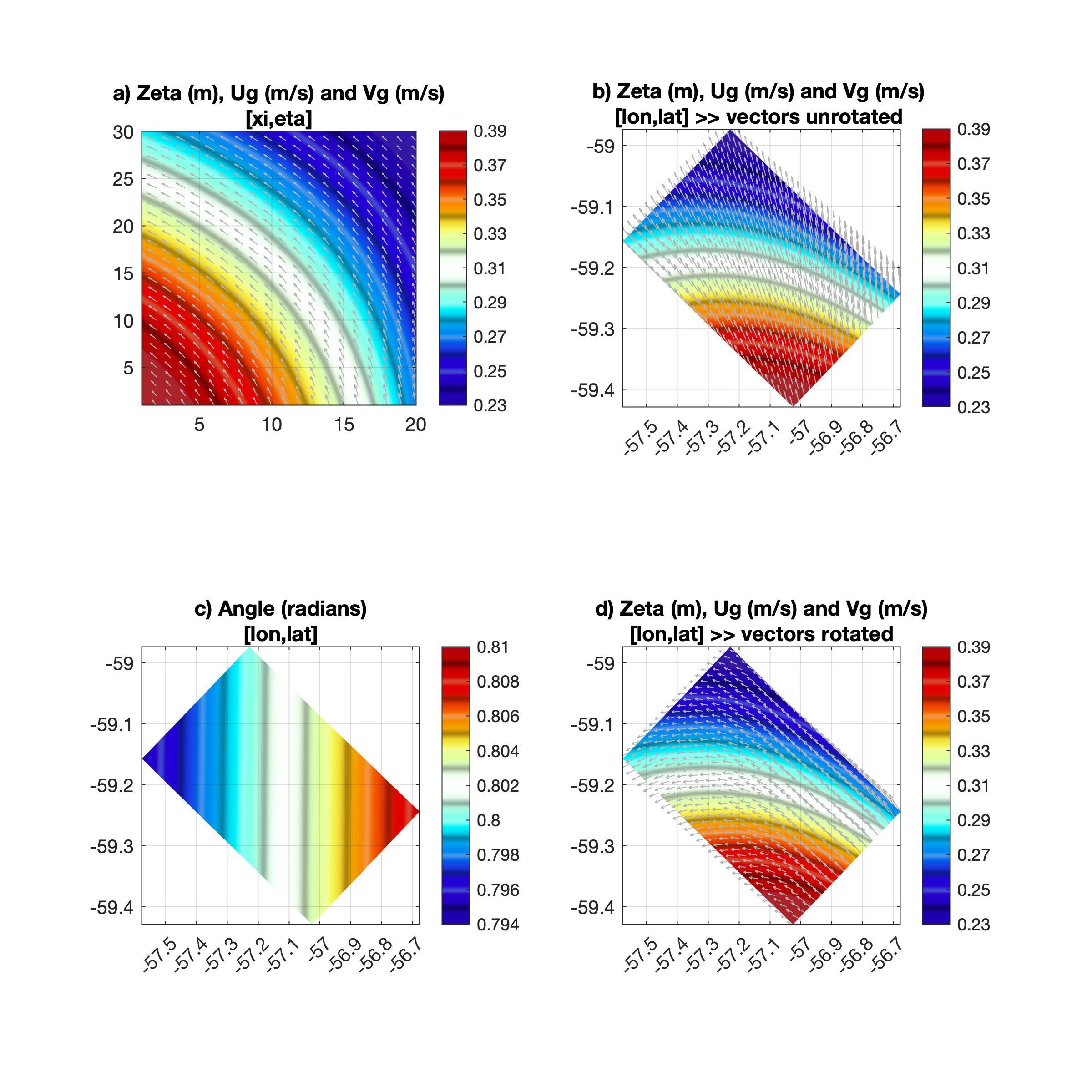 On the other hand, the complete domain of my application include West Antarctic Peninsula. In this sense, I attached a new plot which shows a bigger area and also a greater range of the angle. As you may see, at [xi,eta] coordinates (a and b panels) the velocity components (subsampled each 5 grid points) are aligned with zeta contours. But at [lon,lat] coordinates (c and d panels) the rotated velocity components are not tangential to the zeta isolines both southward and northward to South Shetland Islands among others locations. In this moment I'm a little perplexed, so do you think the issue would be atribuible to something wrong with the angle array?