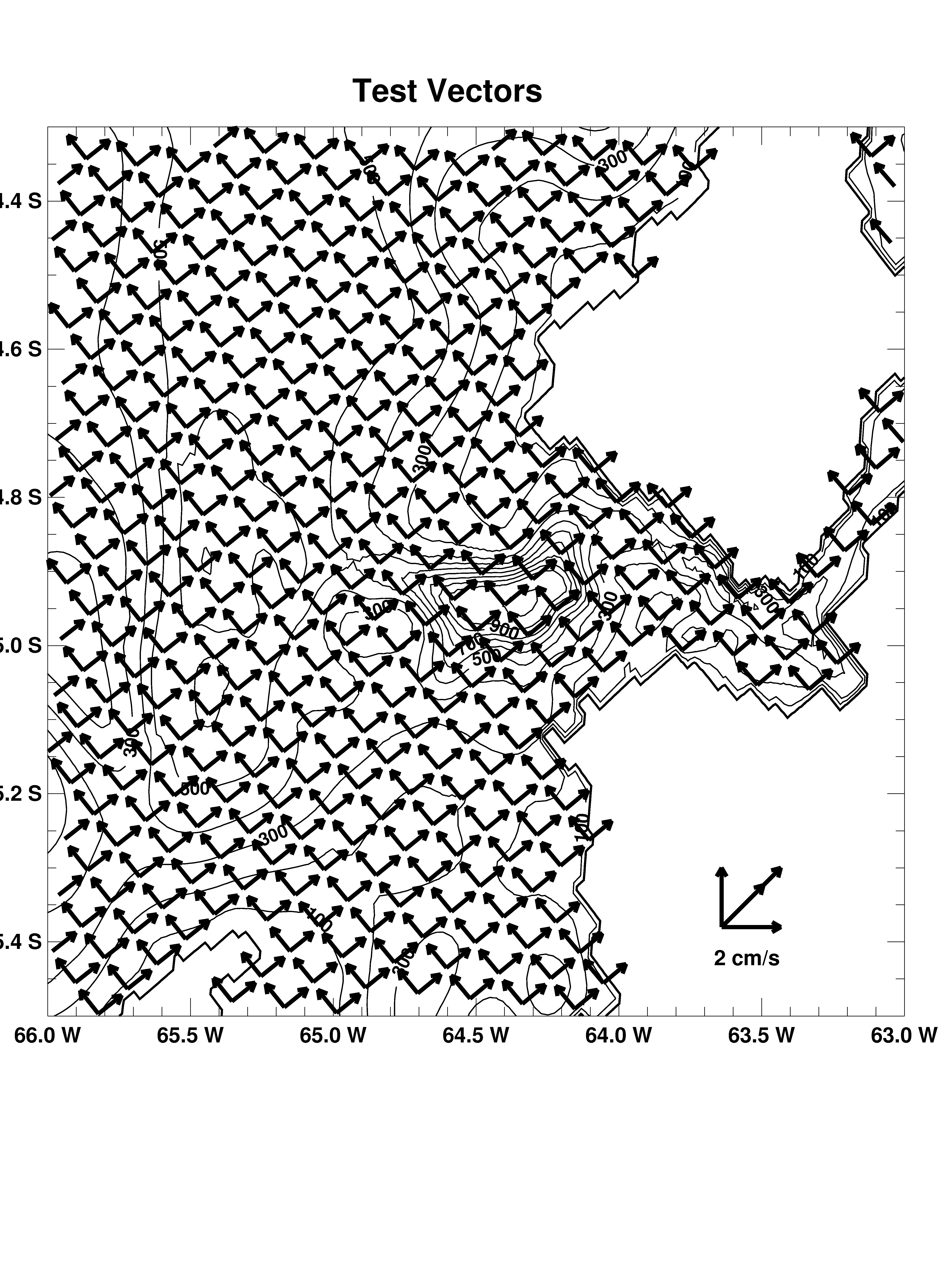 Note that the physical scale along the x and y-axes (km along the earth/inch on the page) is not the same (although it's close with these boundaries, especially at the bottom of the plot), but the scaling that I use between east/north is set so that a vector of a given magnitude will have a constant length on the page no matter what angle it's pointed at.