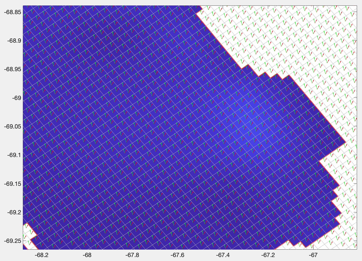 Note that the physical scale along the x and y-axes (km along the earth/inch on the page) is not the same (although it's close with these boundaries, especially at the bottom of the plot), but the scaling that I use between east/north is set so that a vector of a given magnitude will have a constant length on the page no matter what angle it's pointed at.