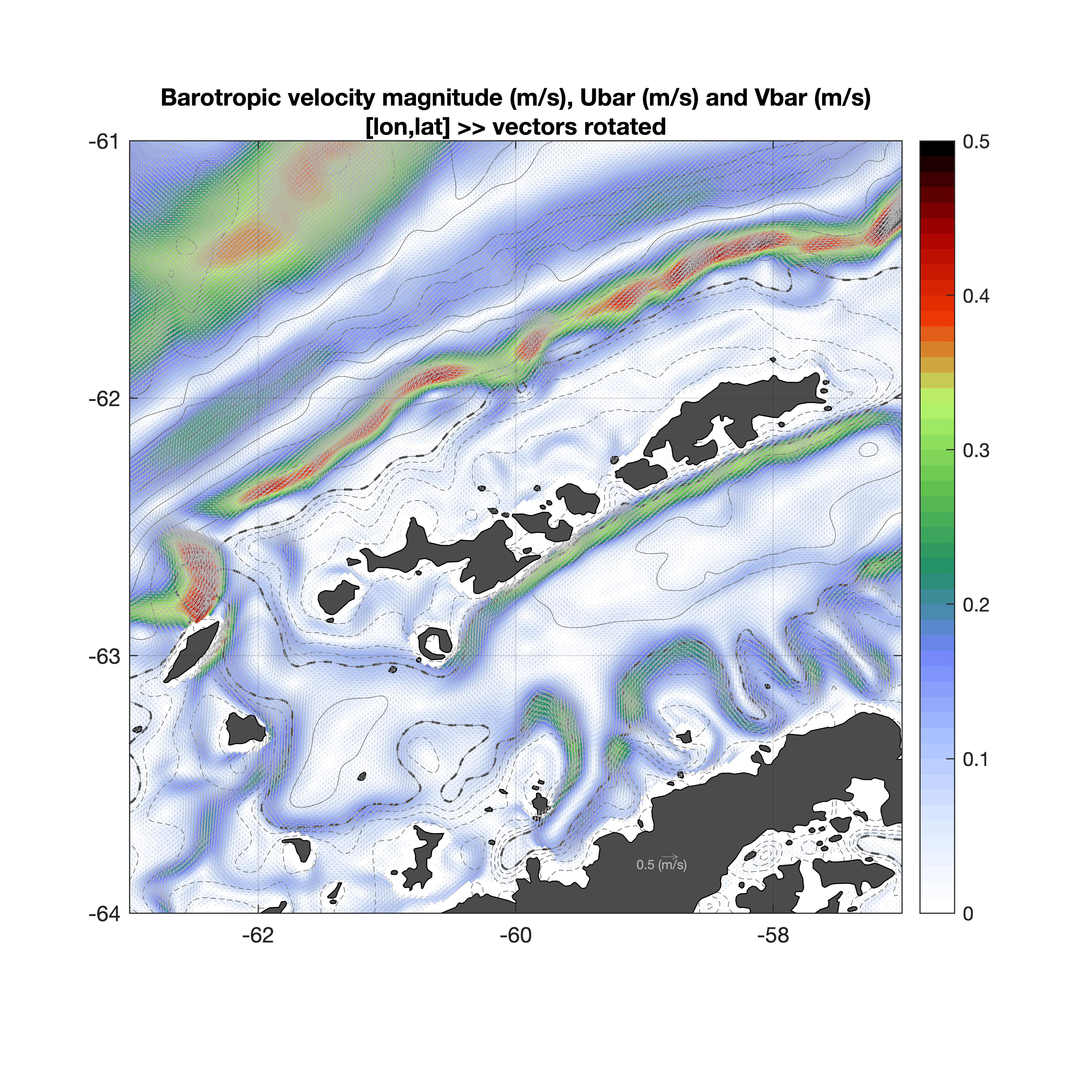 OK Hernan, I made a new plot with barotropic velocities at every grid point. The vectors are plotted using "quiver.m" at the same fashion of "roms_quivergrd.m", I included a vector's scale over the Antarctic Peninsula and I think vector 's tails are located at [lon,lat] grid cells.