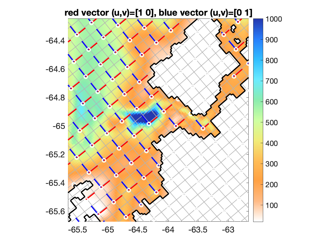 ... that draws what are essentially particle trajectories of duration td days initialized at a set of requested starting locations (lon0,lat0). I repeated my unit vector test with roms_curquivergrd in the attached plot. The red and blue particle trajectories for x and y-dir unit vectors now align with the coordinate grid as they should.