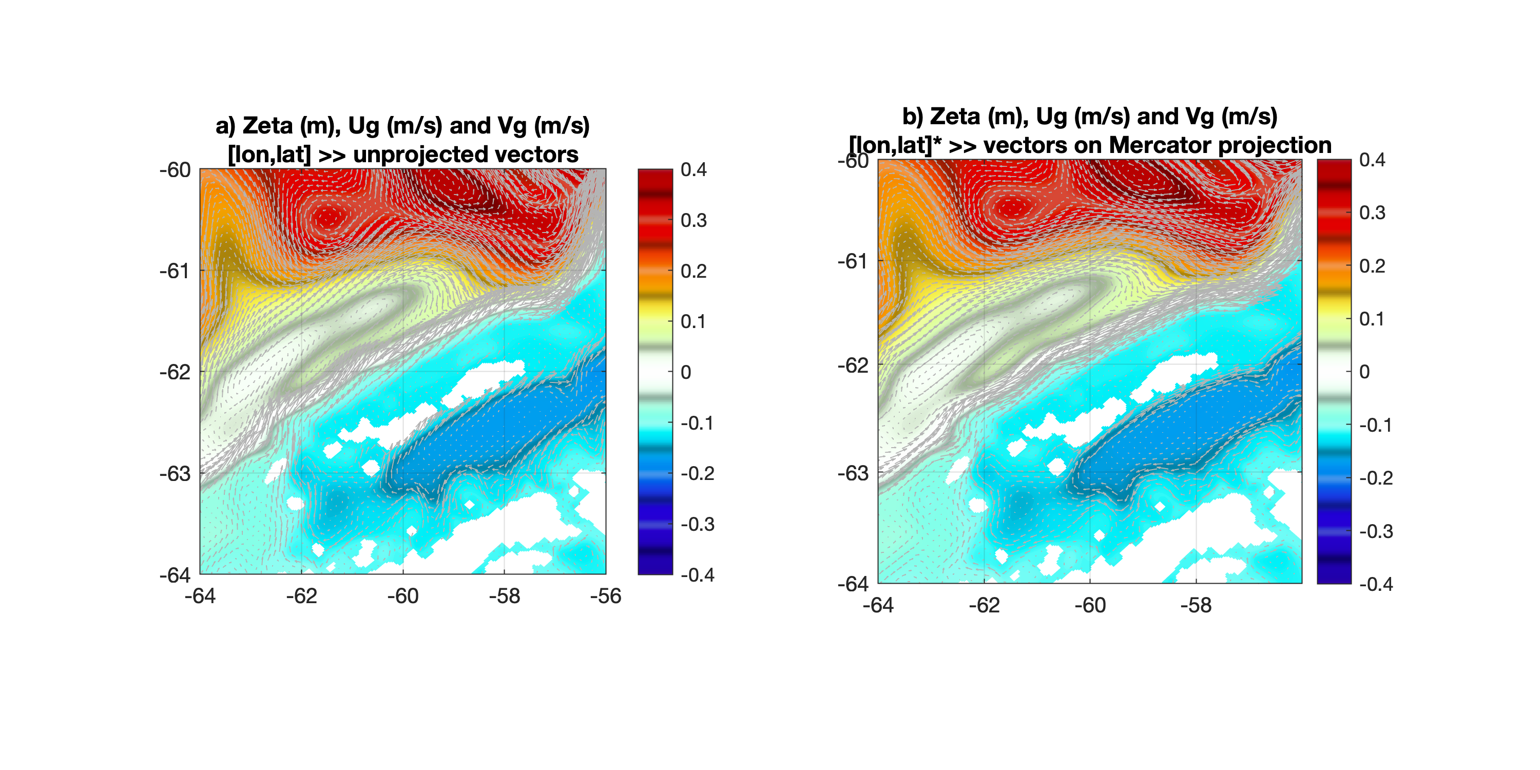 I was doing some tests with vector plots over a map projection and I think could be useful to share it. I attach two Figures with the first areas that I showed (at the beginning of this post) be part of whole West Antarctic Peninsula domain. The left panels shows the geostrophic velocities at (unprojected) [lon,lat] coordinates while the right panels shows the geostrophic velocities at projected Cartesian coordinates over Mercator ([lon,lat]*). As we can see, the projected velocities (right panels) are now aligned with zeta contours, which is great to me and probably Mike's too. Although it is nice to know that this problem is only a visualization matter, I'm still wonder if it could be present at curvilinear applications only?