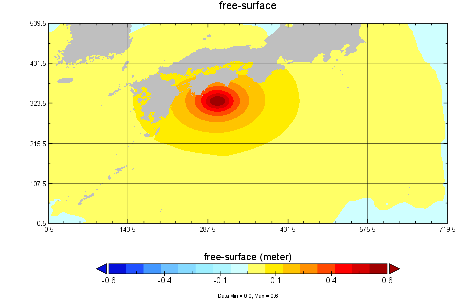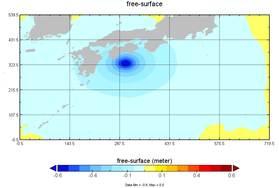 This case is storm surge caused by a typhoon. As a result, the original code shows the water level dropping at the center of the typhoon. On the other hands, the modified code shows the water level rising at the center of the typhoon due to inverted barometer effect.