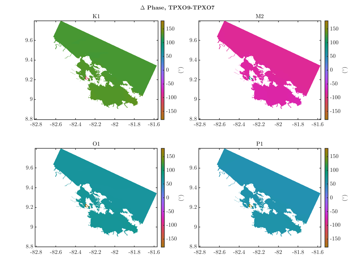 The lines do not overlap with a simple phase shift. I'm attaching a plot of the domain-wide mean phase for the top 4 tidal constituents (which comprise ~90% of variance in UTide analysis of the Limon gauge). There are significant differences between them. TPXO7 is shown in blue, TPXO9 in red, and the difference between them is shown in black on the bottom plot. Here's a similar plot to the top panel above, but showing amplitudes. These are more similar. I really appreciate the help.