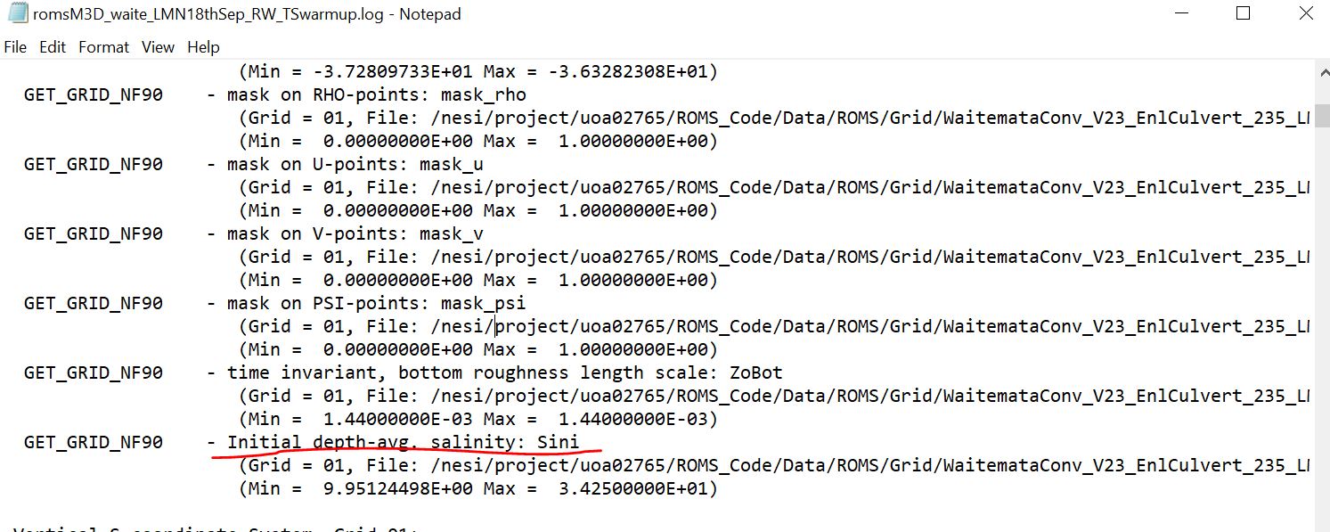 2. Aha, the story is like this. I decided to use the initial salinity field (representative of the April Waitematā) derived from some old reference and our regular monitoring. Yet the initial zeta and velocities are still set to zero (so I started out with the zero velocities and the estimate initial salinity field being the initial condition and did a warm-up run, with TS_FIXED; after a simulation of 10 days, when the residual current structure has been spun up for a spring-to-neap transition condition, I restart the model there). I did not want to prepare a large Initial file whose only spatially-varying variable is salt, so I hacked the ROMS code a bit, to make the ANA_INITIAL.h set initial zeta and velocities to zero, yet read the initial salinity field from file (the attached figure shows that the warm-up model reads in an extra variable Sini from my grid file). I thought here could be some bizarre values in my Sini variable and the wetting and drying, yet after checking I have confirmed this is not the case.