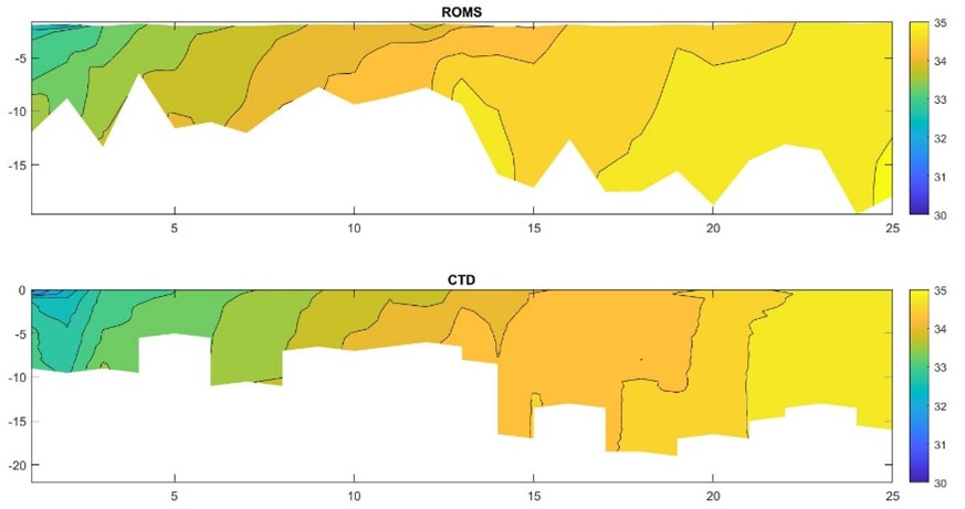 The modelled salt intrusion length appears to be longer, and the modelled stratification is higher. The along-stream depth-averaged salinity is also shown below, where an underestimate of salinity gradient can be noticed.