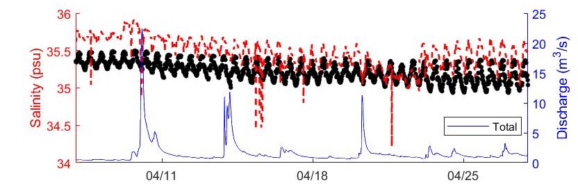 Underestimate of downstream salinity. However, the model may have captured the timing and the amplitude of the fluctuations, since the de-meaned versions compare well (see below; where some very low measured values and the linear downward trend of the red curve might be due to biofouling of our CTD; after 30th/Apr, the measured numbers at SB become very low and appear funny so they are not used for model validation):