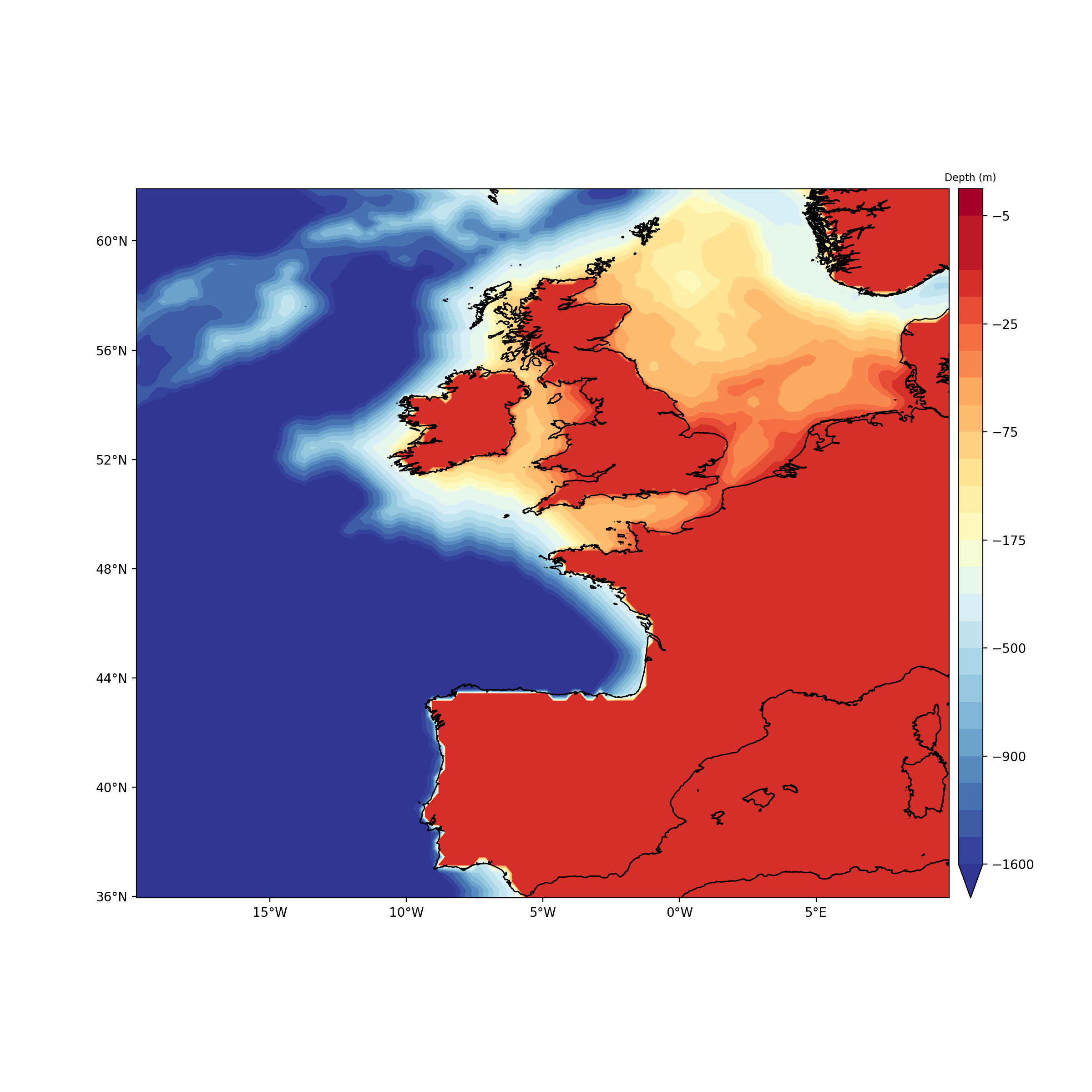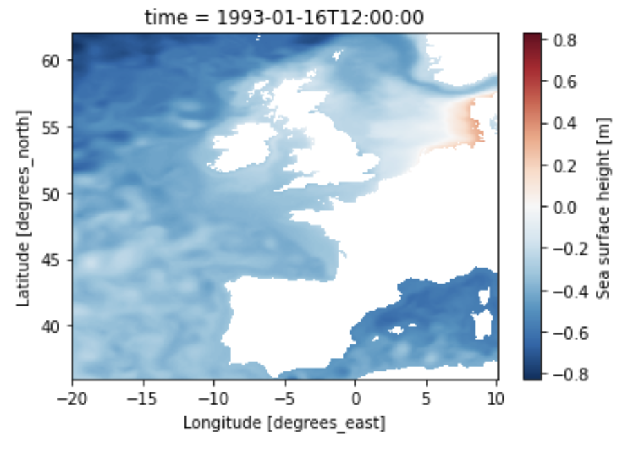 The input ROMS grid file (attached) I use has a resolution of 1/4°. The domain is rectangular from -20°E to 10°E and 36°N to 62°N (glorys has the same domain but 1/12° resolution). Because the domain is rectangular, xi_rho directly translates to longitude points and eta_rho to latitude points (see figures below).