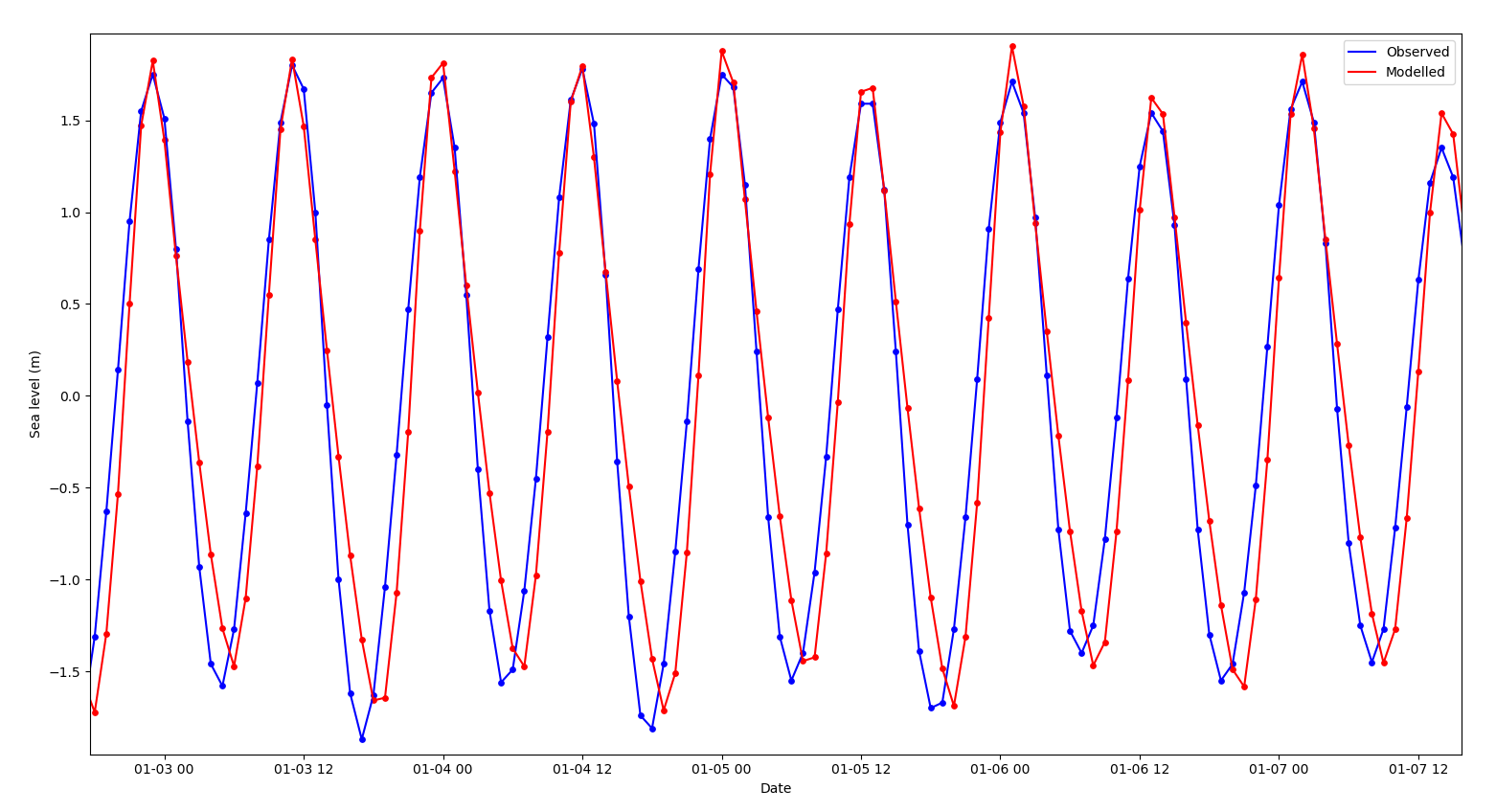 The simulation runs fine for a test period of one month, but when I compare the ROMS output with sea level measurements from a tidal gauge inside the estuary. it shows a flood-ebb "asymmetry" that is not real. As shown in the attached figure, whereas the measurements clearly show a 6-hr flood-ebb alternation, the modelled flood tide lasts about 5 hours, whereas the ebbing phase lasts 7 hours. The tides outside of the estuary appear to be symmetric in this sense. I am wondering what could be the reason for this behaviour.