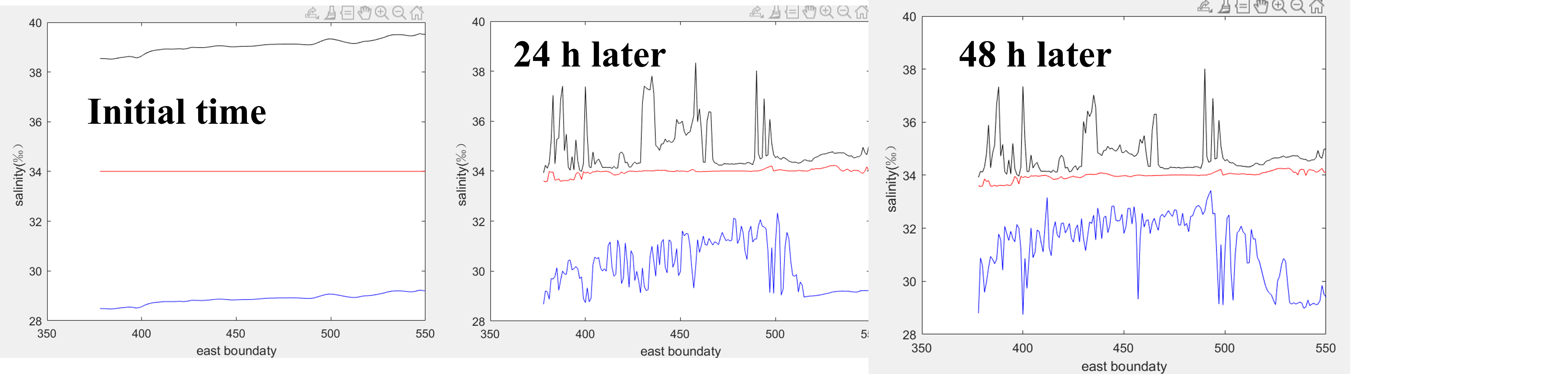 (2) Actually, this problem troubles me for a long time. I did lots of tests. For example, I increased or decreased the sea surface salinity by 10% (i.e., 34‰, up tp 37.4‰ or down to 30.6‰) in all the initial and boundary conditions. When I analyzed the modelling results, I found the increase or decreanse of the sea surface salinity only changes a little (i.e., 0.3-0.5 psu ) shown in figure. Is this correct?