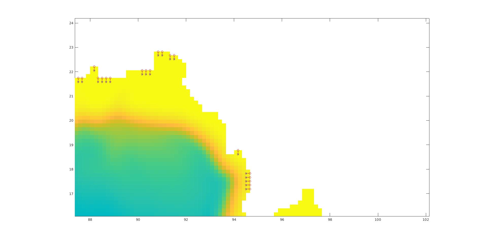 Hello everyone. I want to give river in my domain using LuvSrc = T option and the LtracerSrc = T for both salinity and temperature. For checking, I have used the Matlab function map_rivers.m. The direction of the rivers is attached here. I m literally confused about the direction and the position of the point as I am not getting any influence of these rivers in the salinity field. Not to mention, these are the rivers in the Bay of Bengal with very large discharge values. It would be very beneficial if someone could help me with this issue, whether the direction and the grid point are correct. Do I have to change any other option in the .in file for this as well? Thank you in advance.