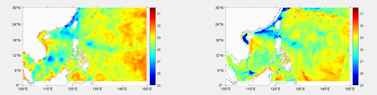 I simulated an tropical cyclone event using ROMS in Northwest Pacific region. I found the SST on the west side of Hainan Island, China, is lower compared with the observations (There is always a cold water inexplicably appearing there). I have modified many vertical parameters (i.e., 30 levels to 16 levels vertically and smooth the bathymetry..) and found that this phenomenon has not changed. I further found that areas with poor SST simulation may match areas with larger grid file RX1 (see the Figure).