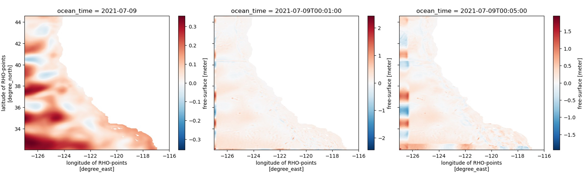 Essentially, a wave immediately (within a minute or less) begins to propagate and expand from the boundaries to the coastline over time. I can still run ROMS for a good amount of time despite this behavior, but I'm also trying to run it within the COAWST system. There I find that it causes the coupled system to crash at the first time step when information is exchanged between WRF and ROMS.