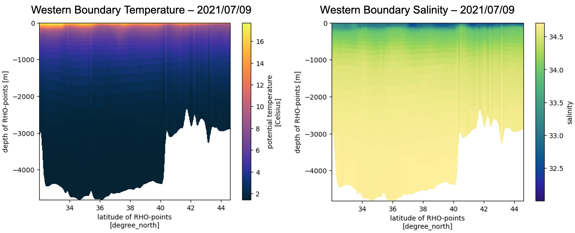 Thanks John. Temperature and salinity look okay to me, below are surface plots and western boundary profile views of both at the starting time step. The next time step is also basically identical.