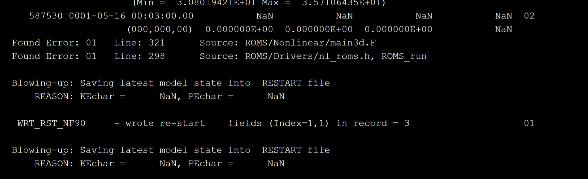 I was running a climate state case recently, and after five months of running the model,the model blow up with the 'REASON: KEchar = NaN, PEchar = NaN' report。This is a nested grid model,