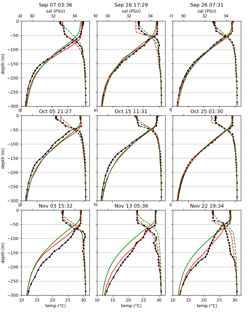 Blue lines are ROMS free run starting from Sept. 30, initialized from NEMO-CMEMS.